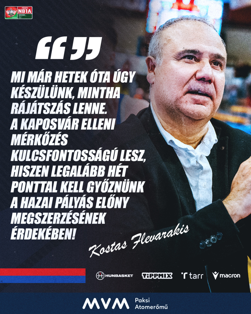 „Mi már hetek óta úgy készülünk, mintha rájátszás lenne. A Kaposvár elleni mérkőzés kulcsfontosságú lesz, hiszen legalább hét ponttal kell győznünk a hazai pályás előny megszerzésének érdekében. Tudjuk, hogy leendő ellenfelünk tele van atletikus játékosokkal és szeretik a gyors, futós játékot. Kemény meccsre számítok, ahol fontos lesz, hogy mi diktáljuk a tempót és a lepattanó csatákat is meg kell nyernünk. Reméljük most is sok szurkoló fog minket elkísérni erre a fontos találkozóra, a bíztatást igyekszünk győzelemmel meghálálni.”