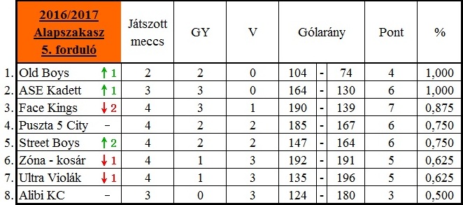 Az élen már csak két csapat veretlen, és bár az Old Boys még csak két találkozón van túl, jobb gólarányának köszönhetően megelőzi az ASE Kadettet. Előbbi csapat szoros első félidő után, magabiztosan múlta felül a még mindig nyeretlen Alibi KC-t, míg az ASE-s fiatalok előbb a Zóna-kosár ellen – egy végletekig izgalmas mérkőzésen – nyertek, majd az Ultra Violákat múlták felül magabiztosan.